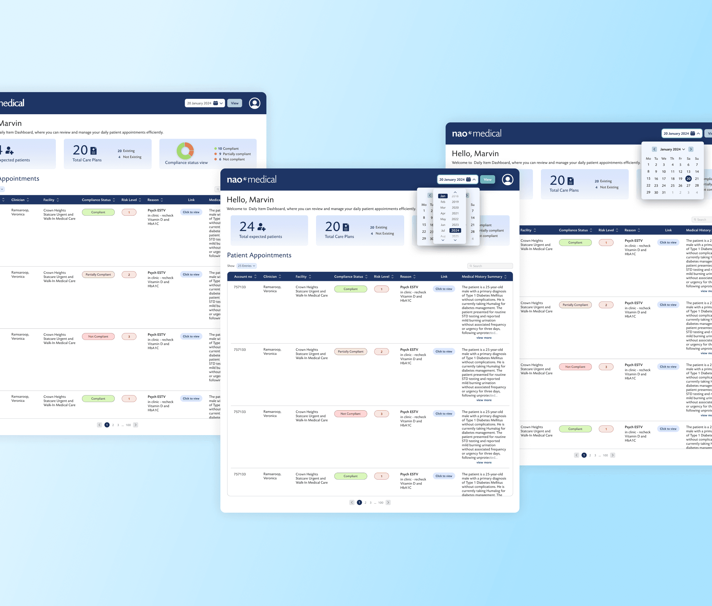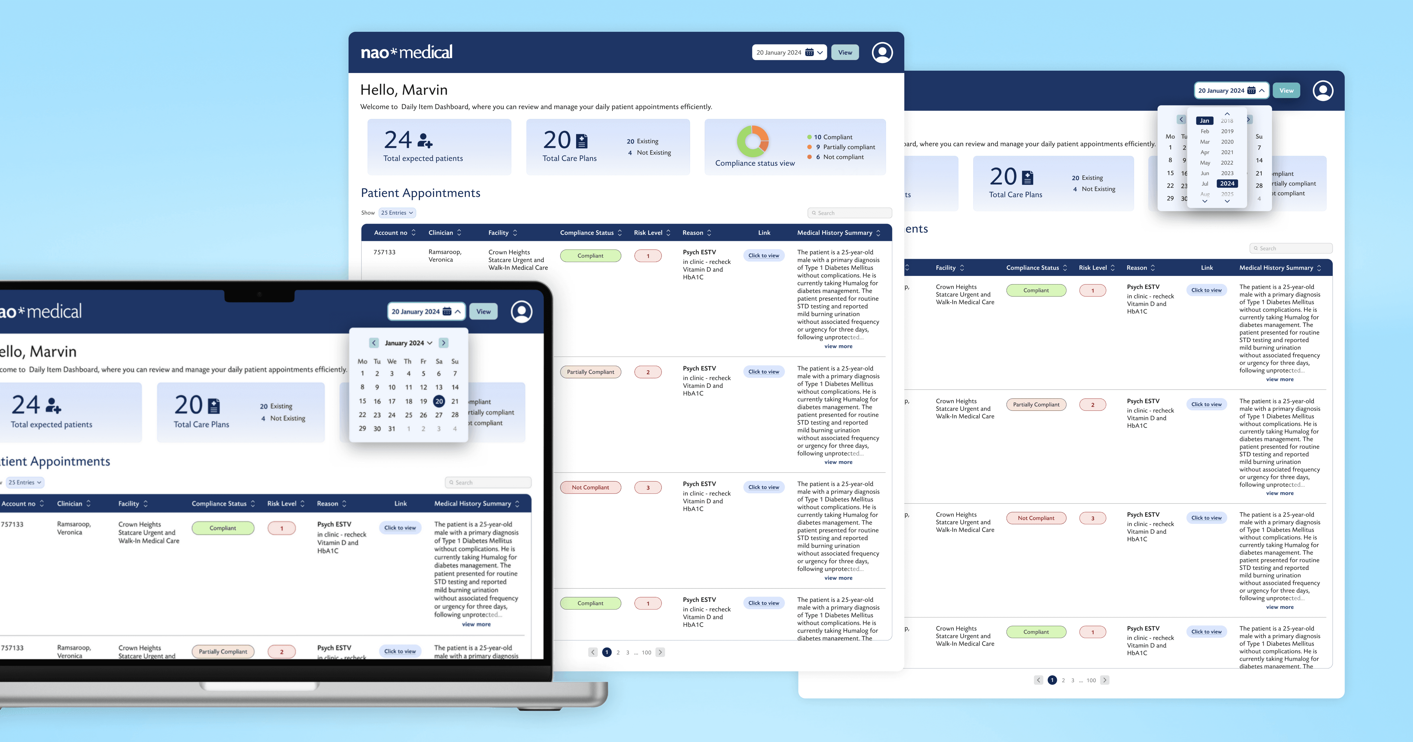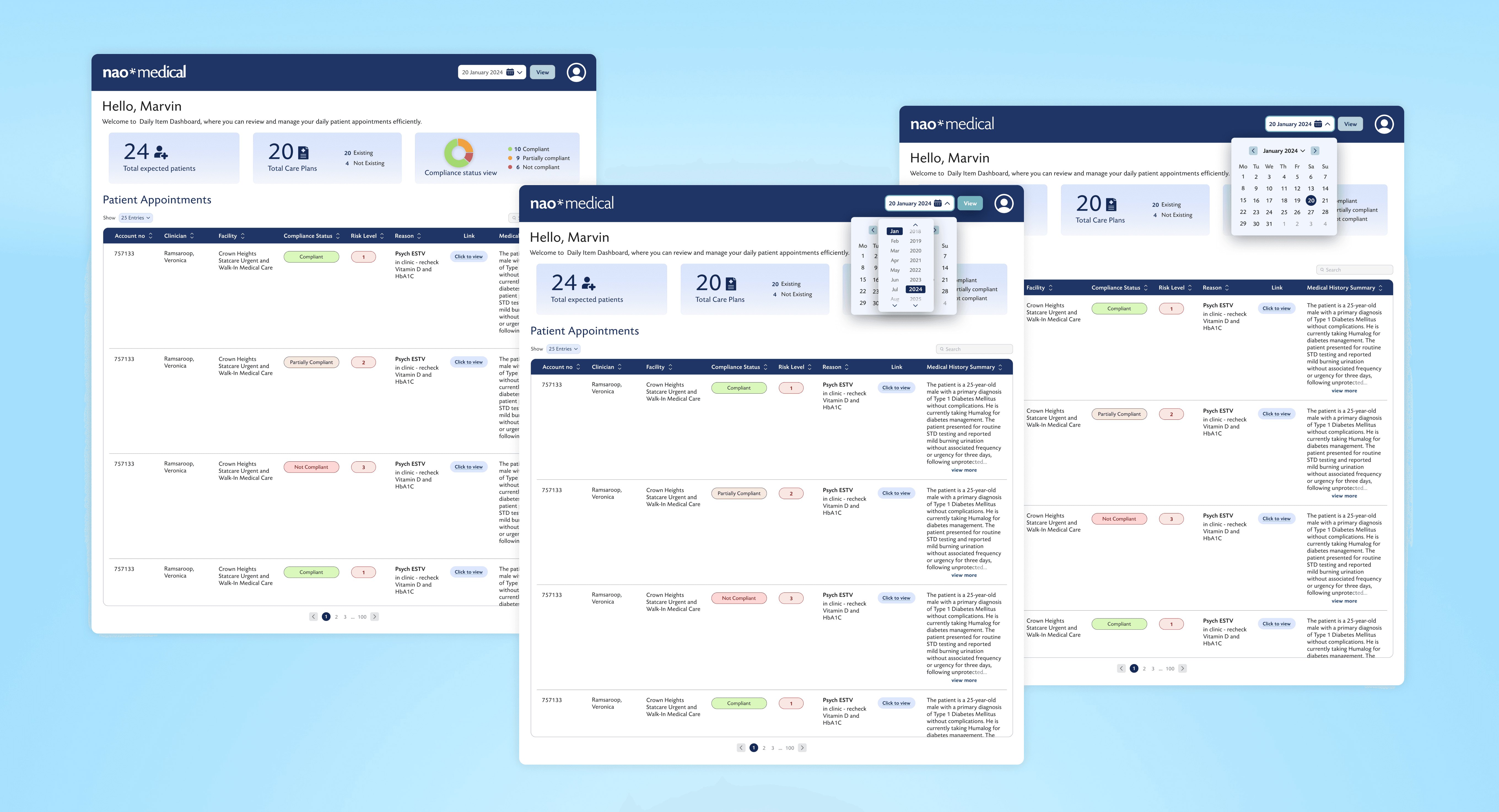 We designed the Daily Patient Brief Dashboard to streamline and enhance the consultation process. This centralized platform provided healthcare providers with a comprehensive view of their daily patient schedule, medical history, and compliance status all in one place.
