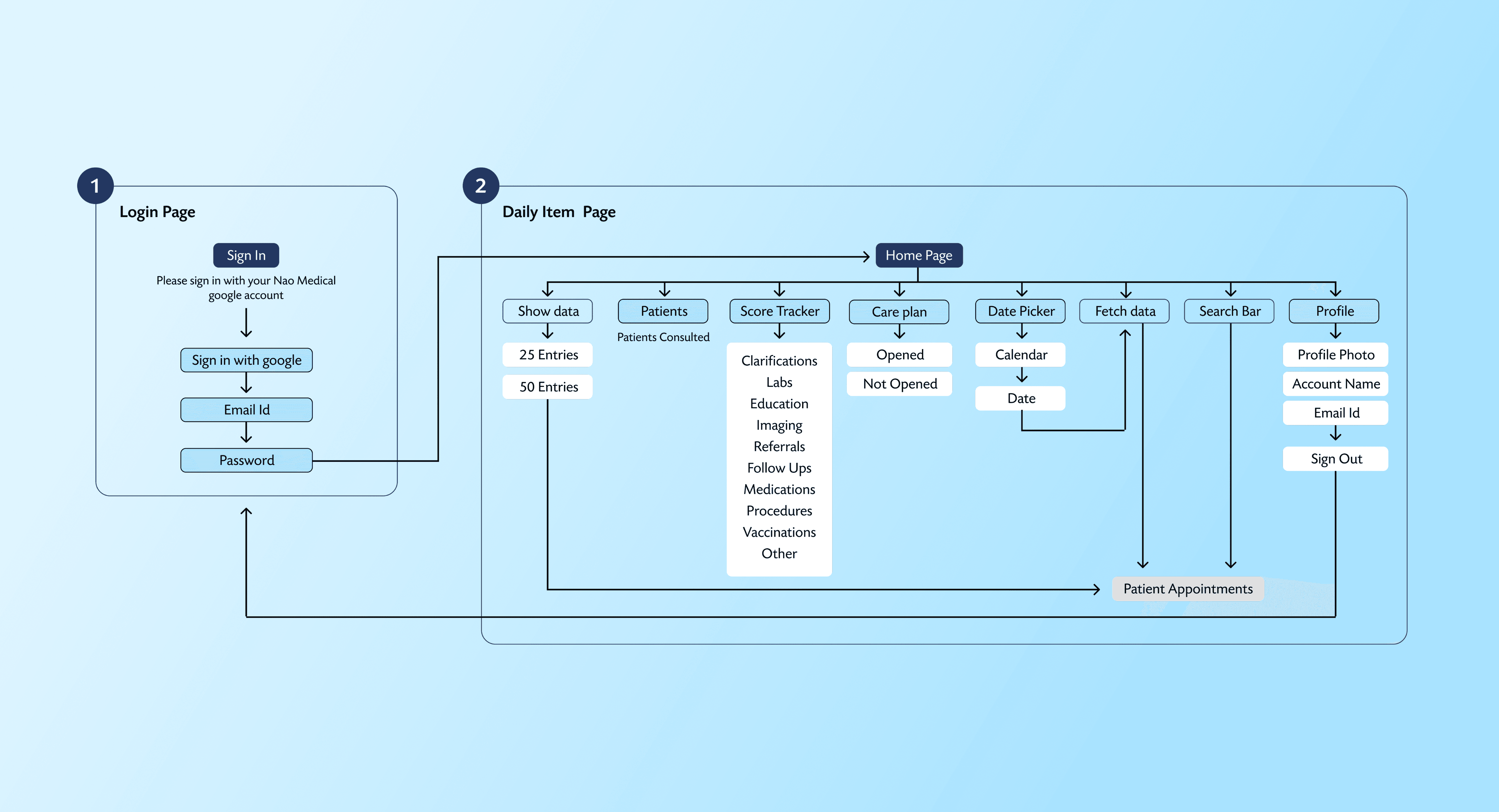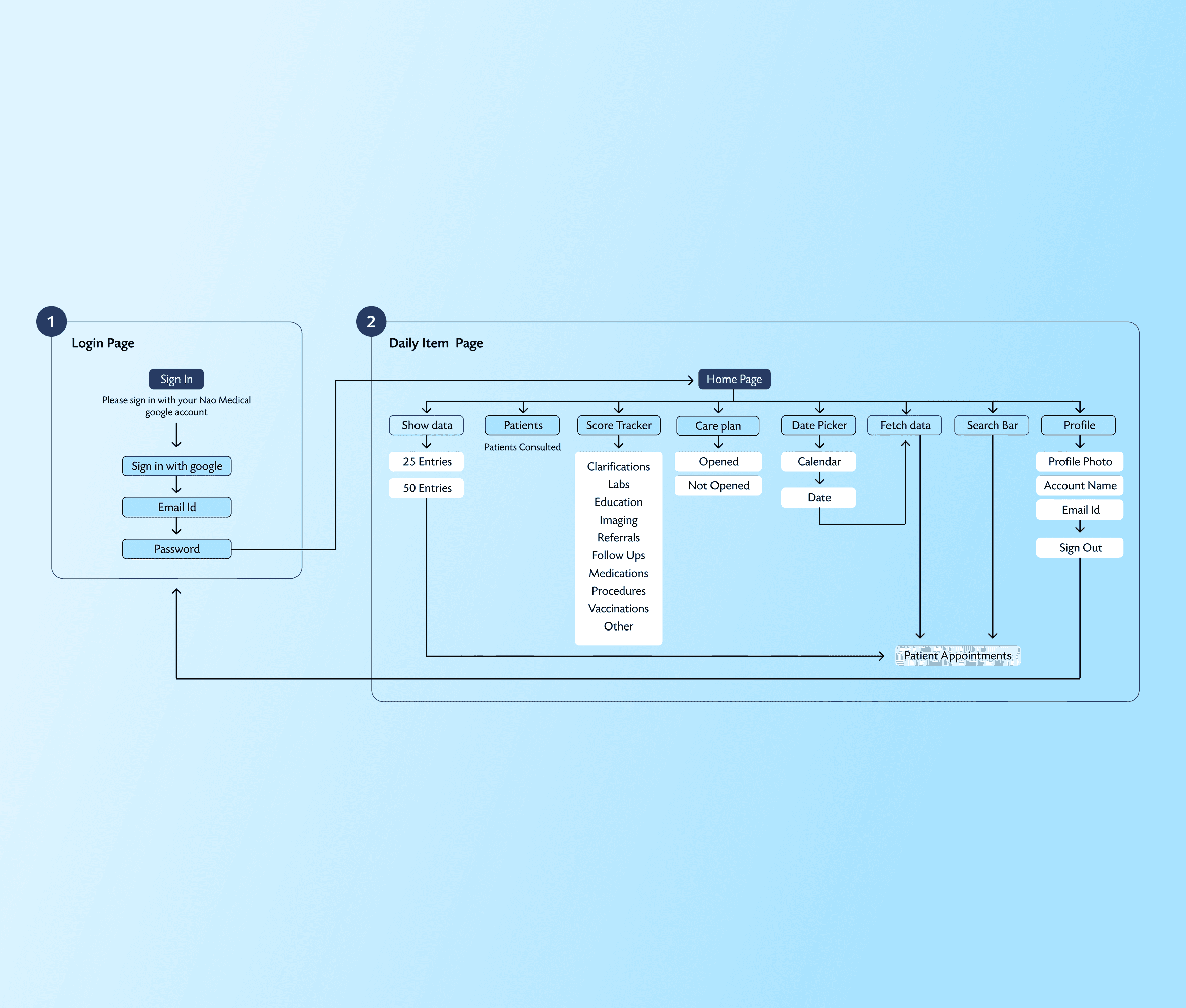 Collaborating with the data scientist, I used the gathered data to draft a user flow that addressed all provider pain points. I then created low-fidelity wireframes to visualize how the dashboard would display data intuitively, ensuring easy navigation and quick information retrieval.