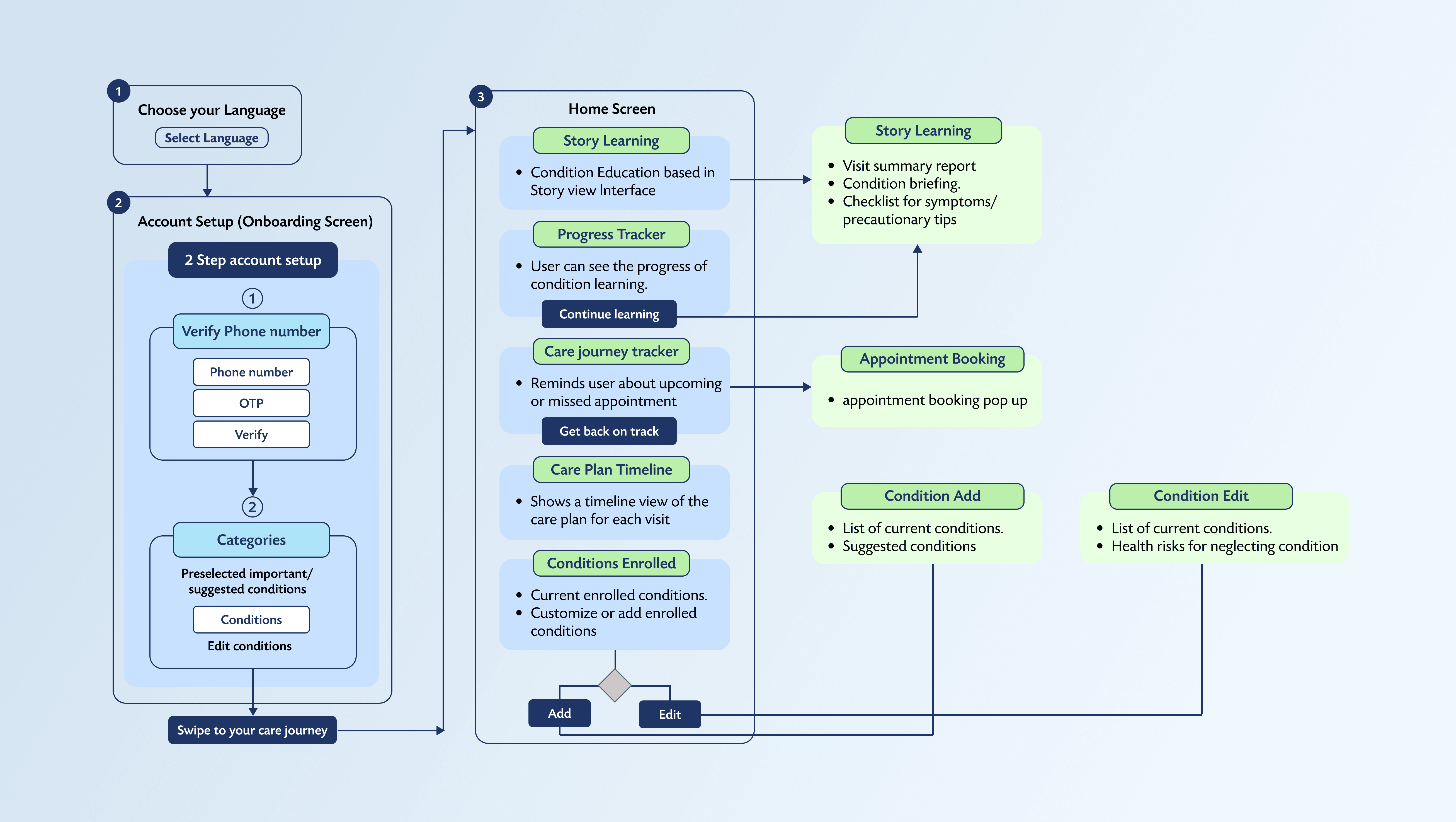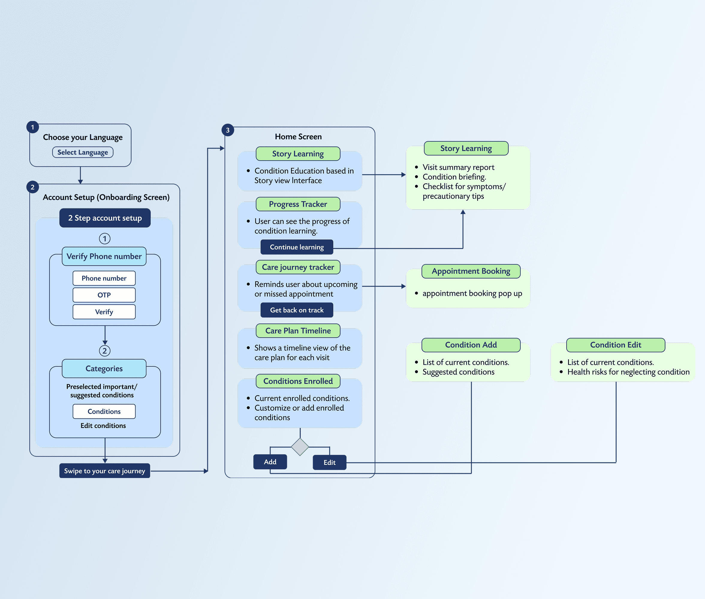 To visualize the solution, I mapped out a user flow chart, ensuring a seamless journey from onboarding to care plan management.